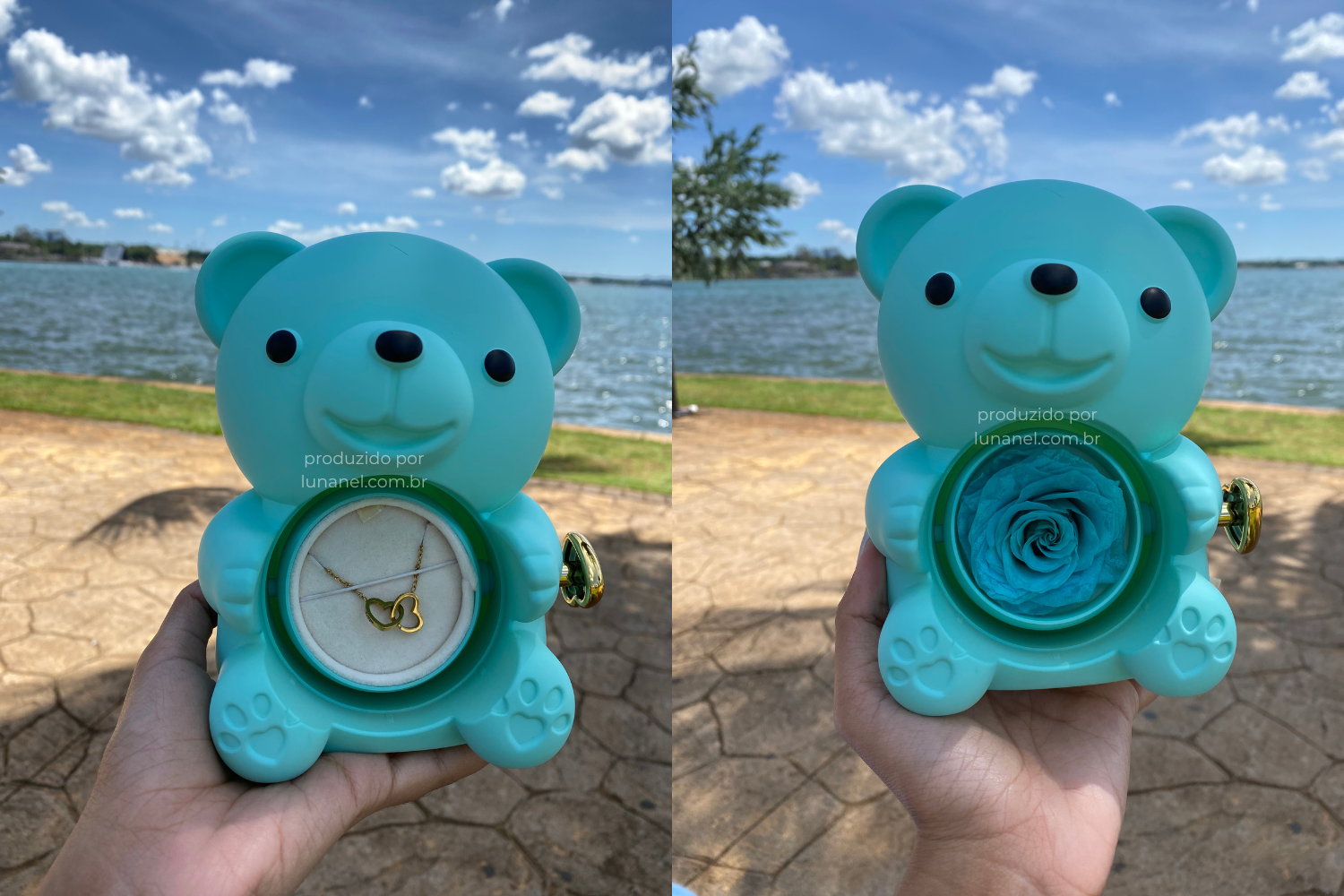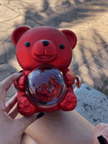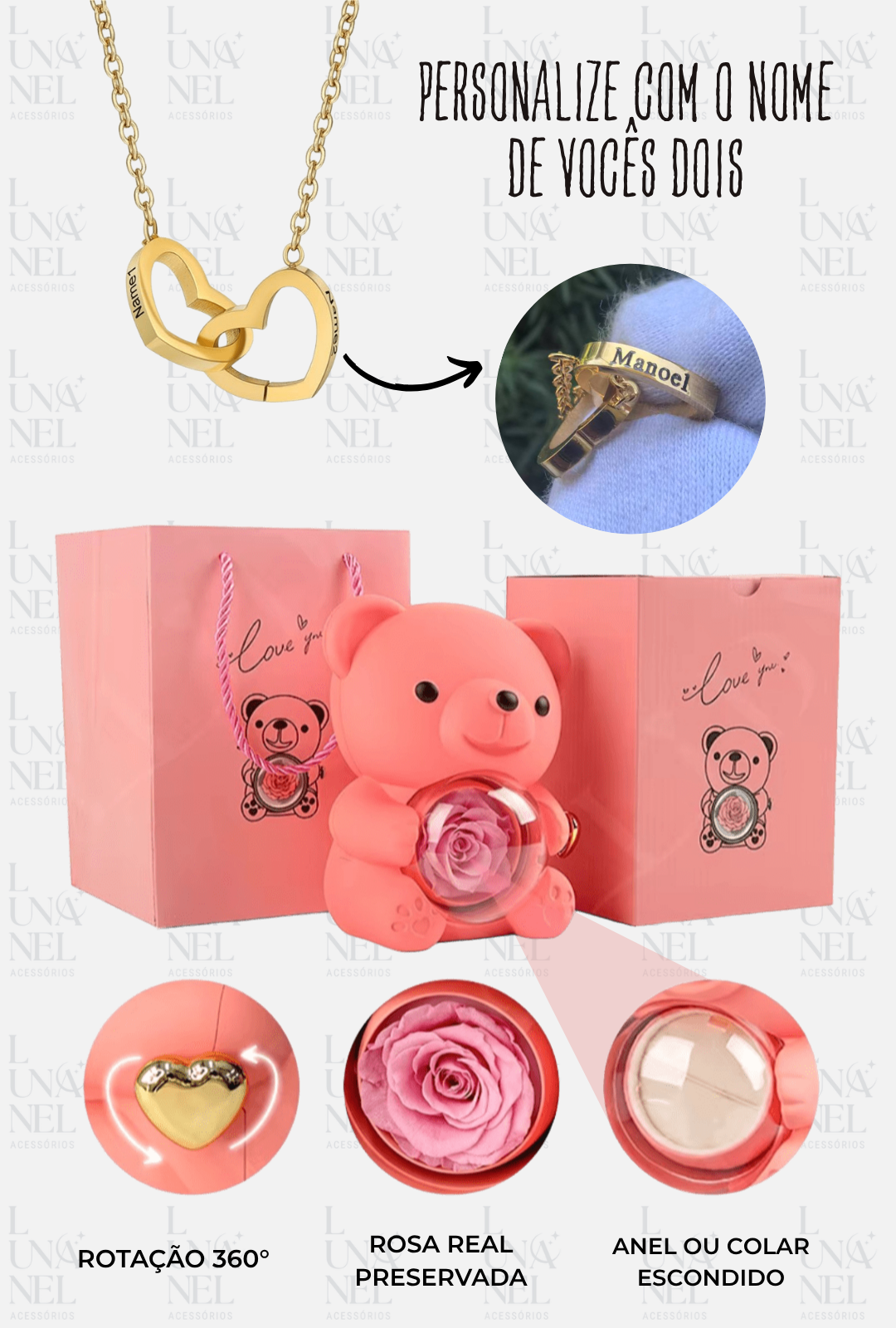 Surpreenda quem você ama com um presente único e cheio de significado. Este lindo urso traz em suas mãos uma rosa real preservada, símbolo eterno do amor verdadeiro. Mas o encanto não para por aí: ao girar o arranjo, revela-se um delicado colar de dois corações entrelaçados, que pode ser personalizado com nomes, iniciais ou datas especiais.